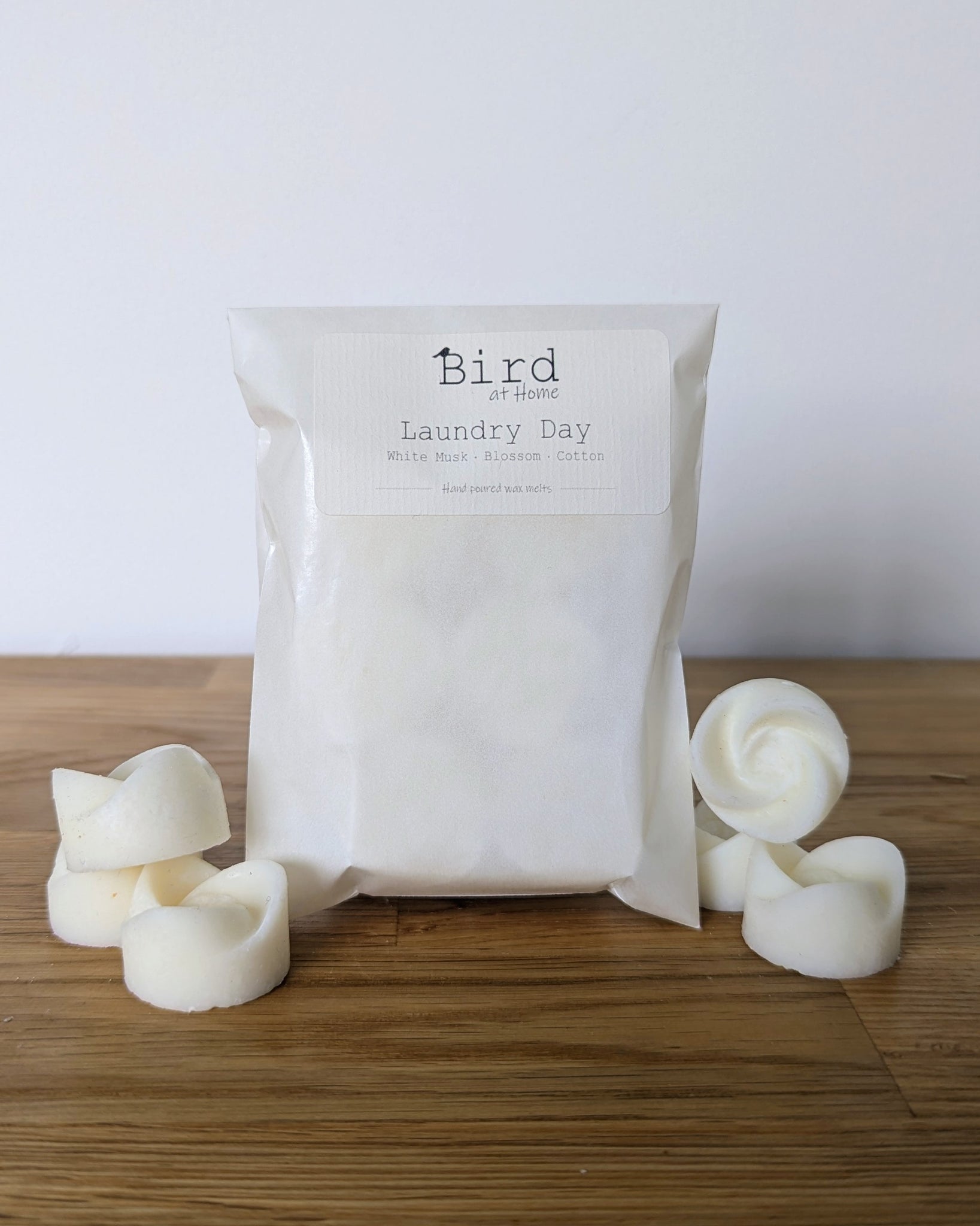 Laundry Day wax melts are swirl shaped. Simply pop 1-2 melts in your wax melt burner, sit back and enjoy. You will receive 6 melts presented in a compostable glassine packet. Each melt lasts approximately 2-4 burns.